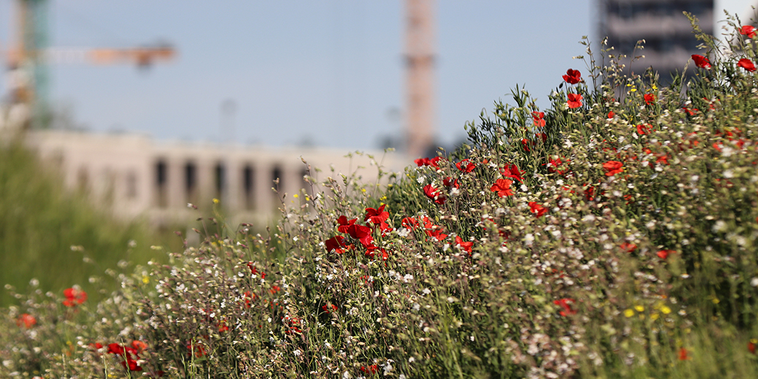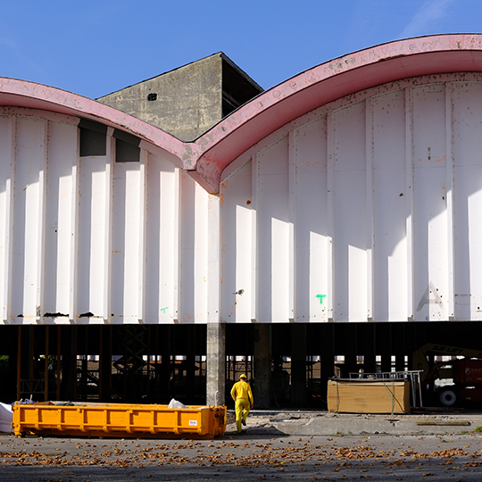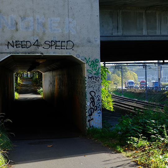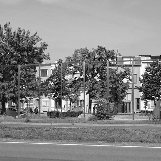This is the Singel, the ring-road around a certain northern European city. It forms a physical and psychological barrier, metal and concrete, between the city proper and the 'parking' that surrounds it: the Zone Grens (Flemish = "Zone Border"), a place of contrasts and contradictions, liminal, unheimlich. A hawk swoops past red poppies, a few paces from a dumped blue plastic toilet. Concealed behind an abandoned, dilapidated warehouse is a quiet patch of water with swans and coots. Concrete blocks turn out to be a sculptural installation, a whimsical arcade of pink arches was a slaughterhouse.